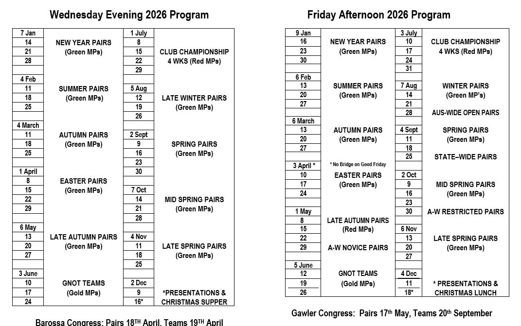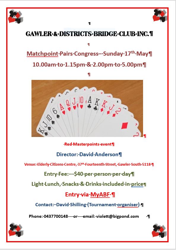 ENJOY A FULL DAY OF BRIDGE IN THE GAWLER ELDERLY CENTRE PARTICIPATING IN OUR PAIRS CONGRESS FOR RED MASTERPOINTS